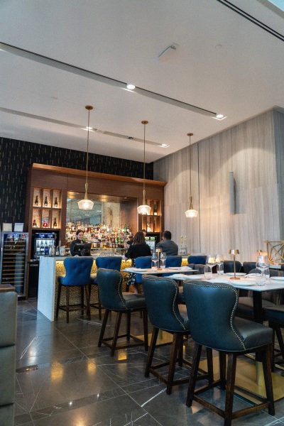The atmosphere is cool and cosmopolitan and features fun, modern touches like light-up menus.