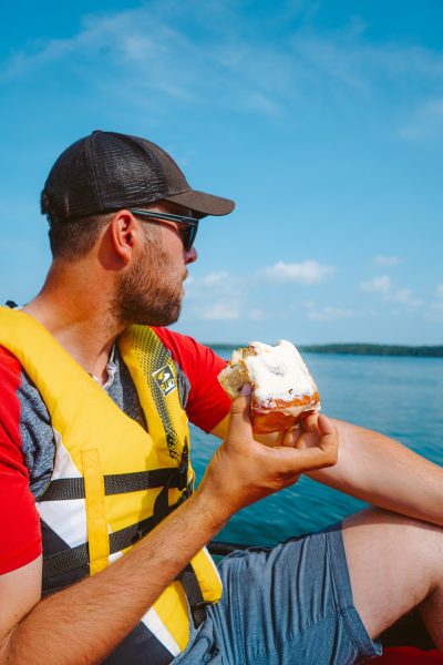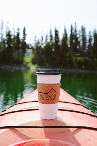 Does food taste better out on the water? We say... yes! We took our breakfast to-go and snagged treats for out on the water. We love food with a great view. It was a no-brainer to do a pick up at the famous Whitehouse Bakery in Wasagaming. A cinnamon bun and coffee for him, and a gluten free chocolate chip banana muffin and tea for me. I have to say, this is the best chocolate chip gluten free banana muffin I have ever had. I was impressed to discover that they had quite the expansive gluten free and vegan menu offering. We paddled across the lake and tucked ourselves close to shore while we floated and finished off our bites. A race to the bouy and back makes for great bragging rights.