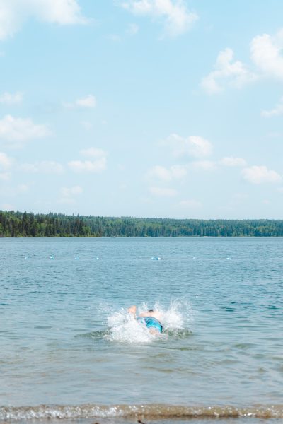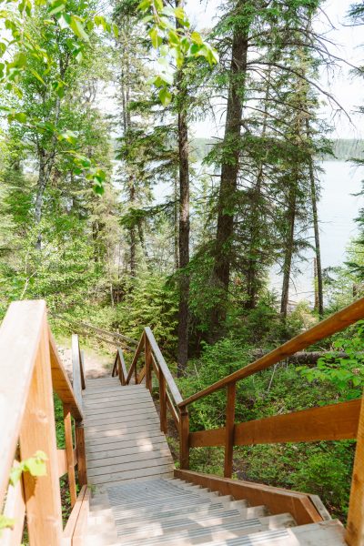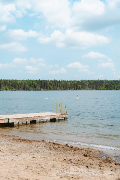 After working up an appetite, head on over to Deep Bay! Located along the shores of Clear Lake and tucked past cottages and private residences, this local spot is an absolute gem, and you'll see why. There you'll find a small parking lot with washroom amenities. Travel down the picturesque wooden stairs (which make for an iconic photo op), and meander around the bend through the trees. With glimpses of blue and sounds of waves you know you are near. Cross paths with historical Riding Mountain National Park buildings and the lush overgrowth of the season. Your feet transition from the crunching of gravel to the smooth and subtle shuffling of sand. You're at the beach! Welcome to Deep Bay.