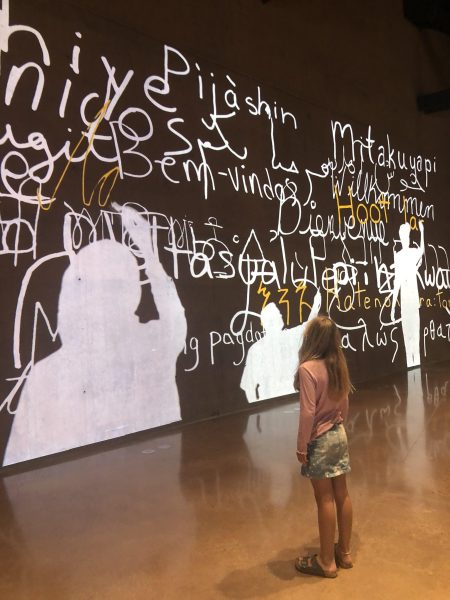As soon as we entered "the roots" at ground level, she was entranced by the dynamic wall of shadowy figures greeting her with different ways to write welcome. She eagerly guessed at a few of the languages.