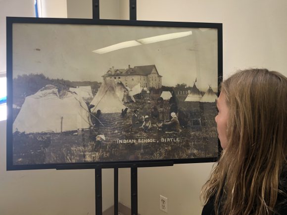 I held my daughter close as we flipped through student's sketch book, stopping at a delicate drawing of a cartoon fawn crying out "Where are you mom?" We starred in silence at the black and white poster-sized image of First Nations families camping in teepees outside the Birtle Residential School, trying to be close to their children.