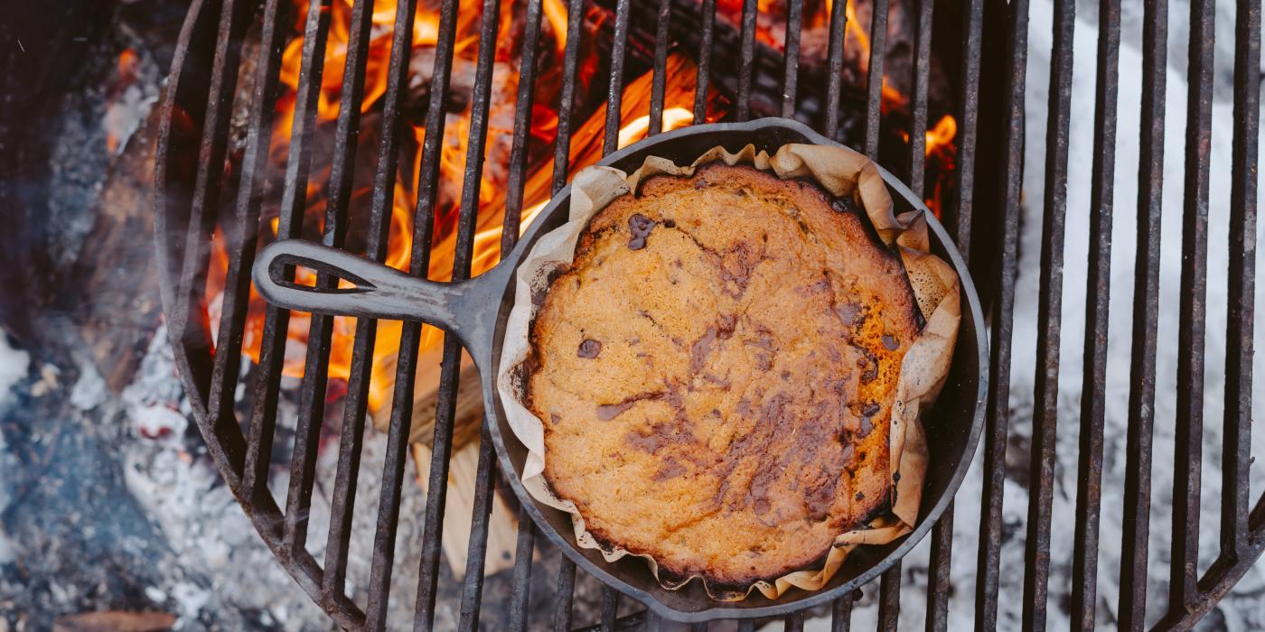Once you've arrived to your site, you'll want to get the fire started as soon as possible. Coghlans Fire Sticks can help with that. Stoke that fire and brush the flame to one side, leaving glowing embers exposed for continuous radiant heat. Using the metal grate provided, you can place the pan on top. You'll want to slowly rotate the cookie clockwise every 5 minutes for about 35-40 minutes to ensure the cookie bakes throughout. The Cabela's Cast Iron Pan Cleaning Kit comes with a handle holder that will help keep your hands safe from heat and additional items for proper cast iron pan aftercare, later on.