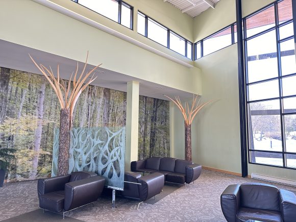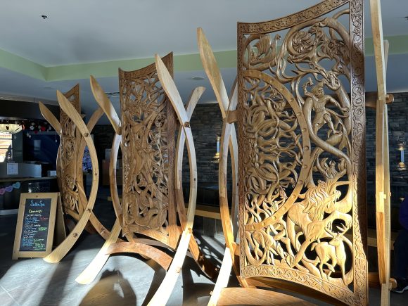 Located on the north shore of the island, tucked between Hecla Golf Course and Gull Harbour Marina, the Lakeview property's earthy design blends into the natural landscape. The glass and timber-framed lobby creates a bright and airy welcome. Wood carvings of Norse mythology, verdant curtains of birch trees and a babbling indoor creek made of river stone all help to set the mood for an adventure in nature.