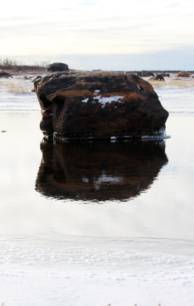 After seeing the stunning landscape from the plane, I was eager to explore it a bit more – and lucky me, all excursions from Seal River Heritage Lodge are done on foot. Being an eco-lodge, the use of land vehicles is kept to the beach ridges and tidal flats, and no driving is allowed on the vegetated tundra. I was amazed at how quickly the land changed during my trip. The coming and going tide frequently transformed our surroundings, and snow covered the ground alongside bright cranberries and short, flag pole trees, known for their distinctive shape.
