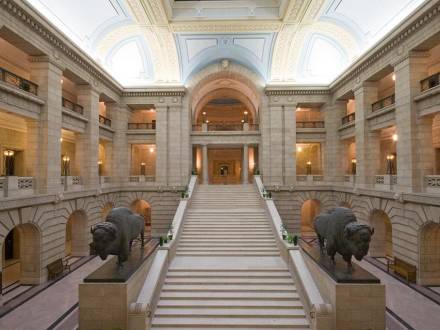 At the turn of the twentieth century, members of the provincial government were unanimous in their desire to construct a building that would serve as a symbol for the people of Manitoba. Completed in 1920, the Beaux-Arts Classical-style building features a grand staircase, matching bison statues, Manitoba Tyndall limestone and the famous Golden Boy statue atop the dome. The grounds contain statues of Queen Victoria, La Vérendrye, statesmen and poets. Location: Broadway and Osborne.