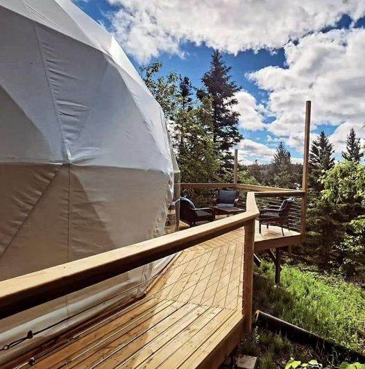 Unique stays. 4 season Geodesic Dome located on a 5 acre private lake front property just outside side of Flin Flon Manitoba. Our 1st dome is opening in July 2024. It includes a king bed and queen in loft. Kitchenette and washroom. Air conditioning. A beautiful deck with seating for 4. Wood fire hot tub coming soon. The domes are 18+. Up to 4 adults. We rent out kayaks, canoes and snowshoes. We are connected to provincial snowmobile and ski trails. We also have a small gift store The Nest that showcases local provincial and Canadian products and giftables. We have a small farm animal sanctuary and we are famous for our family orientated goat walks! Darren and I wanted to bring something unique and different to the North! Come experience your own private sanctuary in the Northern Boreal forest and let your soul soar at Ravens Hollow!