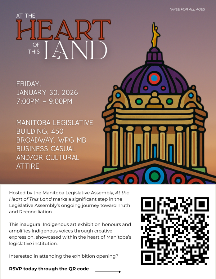 At the Heart of This Land invites a reclamation of space and an amplification of Indigenous voices within the Neoclassical context of the Manitoba Legislative Building. Winnipeg, known as the heart of Turtle Island, serves as a powerful backdrop to this initiative, symbolically and physically placing Indigenous art at the heart of Manitoba’s legislative institution.