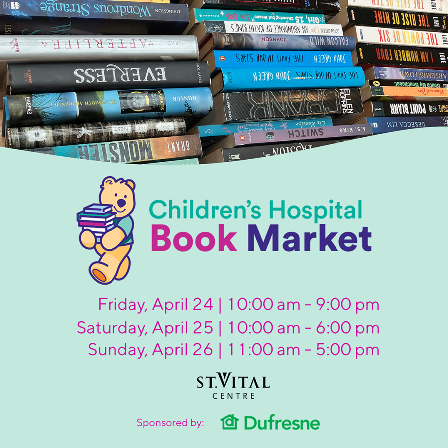 Visit St. Vital Centre from April 24 – 26 to shop for great books of all genres and support sick and injured kids in your community at the Children’s Hospital Book Market! All funds raised stay in Manitoba to help kids who need HSC Children’s Hospital.