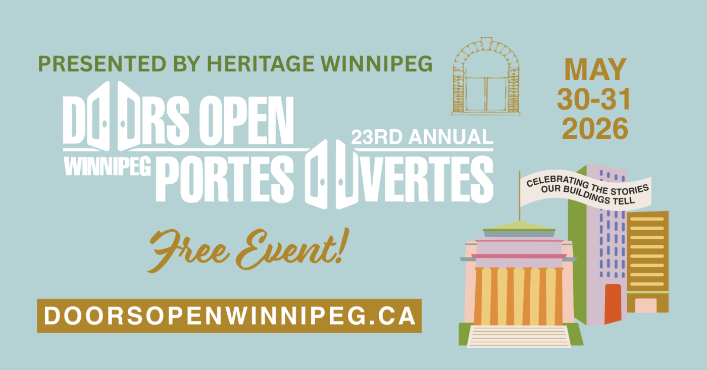 Heritage Winnipeg is excited to present Doors Open Winnipeg 2026, a FREE public event celebrating Winnipeg’s built heritage, cultural institutions, and historic streetscapes. Occurring on May 30th and 31st 2026, this event gives you the opportunity to look into Winnipeg’s fascinating history through open buildings, educational tours, and enjoyable events. Come visit with passionate volunteers, ready to share their knowledge and put a smile on your face. Winnipeg’s rich past and stunning architecture are available to you all weekend, for this amazing once-a-year free event. We hope you will join us in celebrating the stories our buildings tell! For more information, please visit www.doorsopenwinnipeg.ca