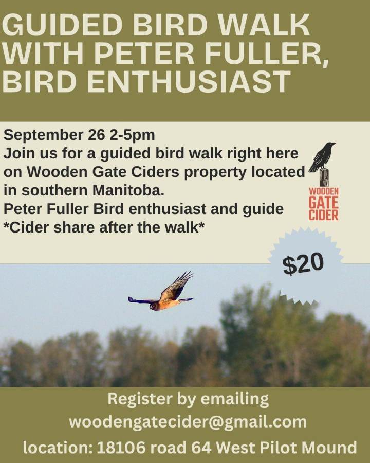 Join us for a guided bird walk right here on Wooden Gate Ciders property located in southern Manitoba.