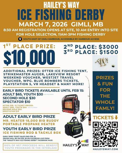 The 1st Annual Hailey’s Way Ice Fishing Derby is on March 7! All net proceeds will go to support youth programs in the Interlake. Follow to stay up to date about details, prizes and more!