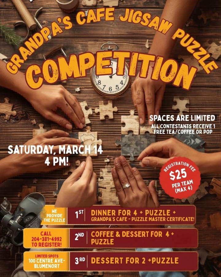 Are you a fast puzzler? Grandpa's Cafe in Blumenort challenges you to puzzle for prizes! Only 10 spots left!!! Call to sign-up: 204-381-4992. We are open M-W 8-2 pm, Th-Sat 8-8 pm and Sun 10-3 pm.