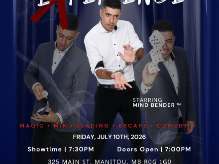With over 15 years of professional performing experience, Mind Bender has appeared on Canada’s Got Talent, been personally invited to perform at Michael Jackson’s home, shared the stage with Criss Angel in Las Vegas, and entertained audiences for major international brands including Honda Motors, Emirates Airlines, and Sheraton Hotels & Resorts. Now touring across Canada — including a special stop in Manitou, MB — this is a show you won’t want to miss.