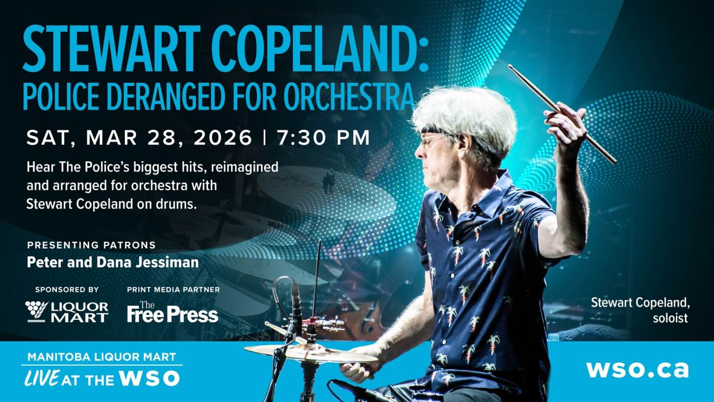 Stewart Copeland joins super fan Music Director Daniel Raiskin and the Winnipeg Symphony Orchestra, along with singers and guitars, in a high-energy orchestral evening that focuses on the epic rise of the iconic musician’s career — with Stewart himself on drums!