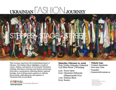 colour, rhythm, and passion presented through Ukrainian clothing, folk dance costumes and modern streetwear. Each piece is a masterpiece reflecting distinct regional diversity, ancestral heritage and powerful symbolism related to protection, nature and life's journey serving as a talisman of strength, pride and resilience against hardship and war. Each pattern and colour tells a unique story warding off evil and bringing prosperity and hope for an end to the existing war in Ukraine.